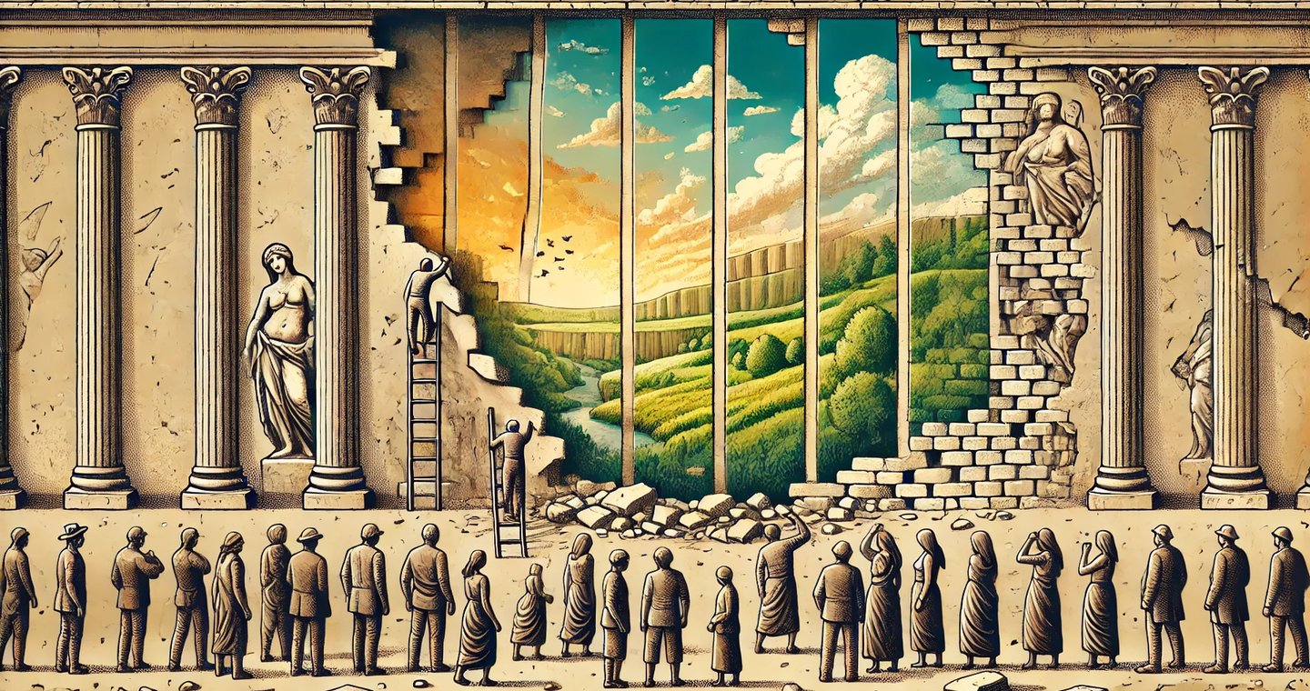Non è qualunquismo, non è nemmeno facile satira. È un fatto. Un dato di realtà che continua a svelarsi sotto i nostri occhi, anche se fingiamo di non vederlo. Le fondamenta del nostro vivere sociale sono fradice, marce, consumate da anni di ipocrisia, abitudini stanche, modelli obsoleti. Abbiamo costruito sopra colonne che non reggono più, architetture ideologiche e politiche che scricchiolano a ogni scossa, e il rischio del crollo è sempre più concreto. Occorre iniziare da qui, dal coraggio di guardare in faccia questo declino. Il primo passo è rifiutarsi di essere semplici mattoncini di un edificio che non rappresenta più nessuno, un edificio decadente che non ha più nulla da dire. Non possiamo più limitarci ad adattarci, a sopportare, a collaborare passivamente con un sistema che ha smarrito ogni connessione con il senso e con la realtà. Il rifiuto non è ribellione fine a se stessa, ma atto di consapevolezza.